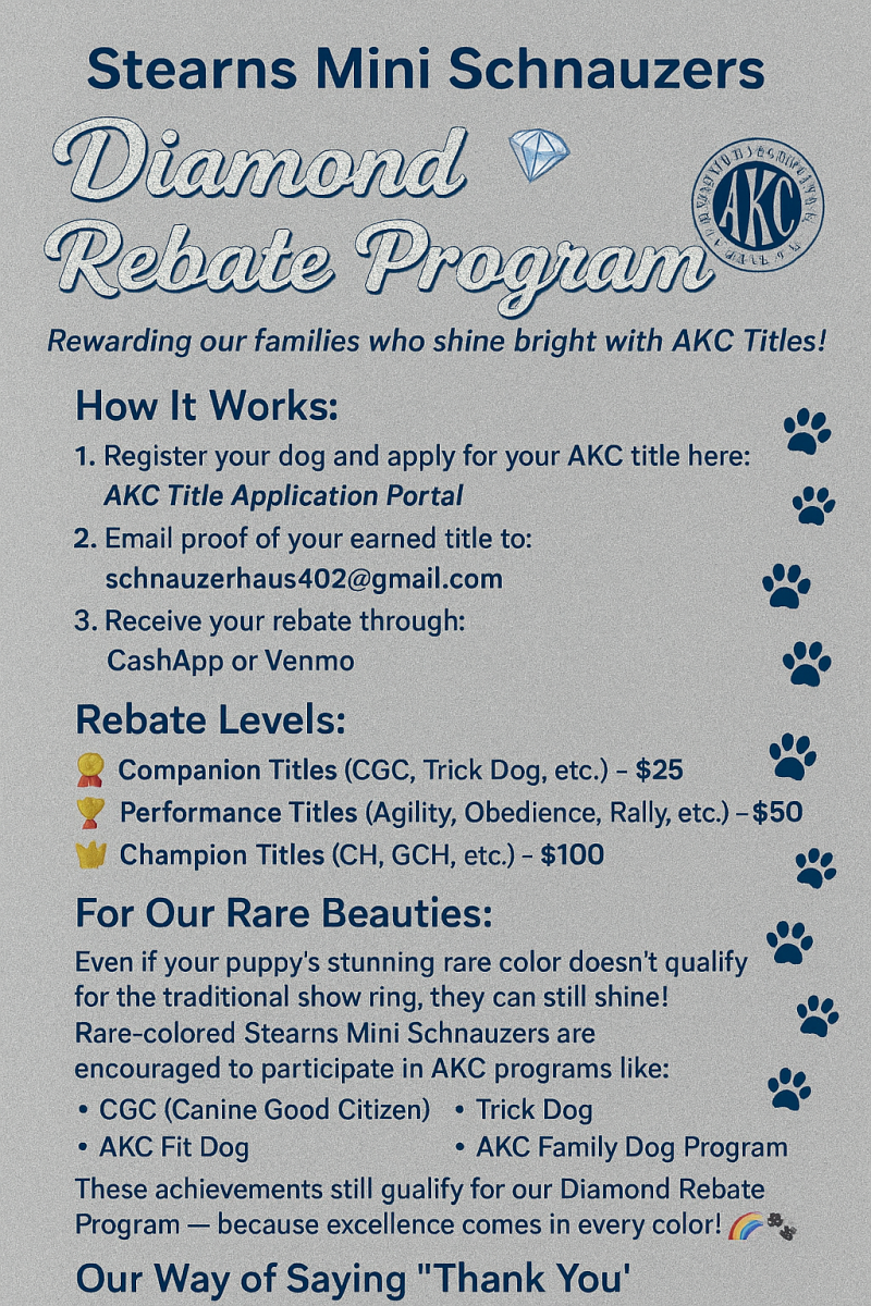 Stearns Mini Schnauzers Offers a "Diamond & Gems Rebate Program for Owners Earning AKC Titles: